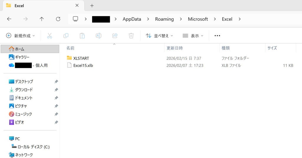今回の場合は 「XLSTART」「Excel15.xlb」の1フォルダ、1ファイルを削除する