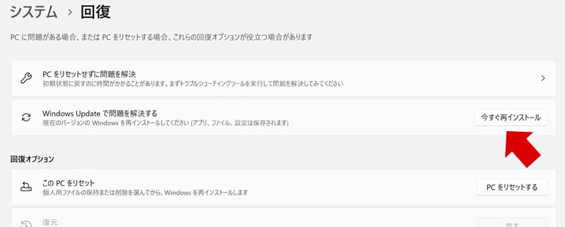設定>システム>回復>Windows Updateで問題を解決する 今すぐ再インストール